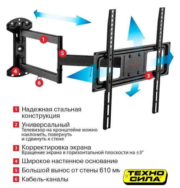 для ЖК-телевизоров, 32-55", настенный, поворотный, встроенный уровень, наклон 13°, поворот 180°, цвет черный