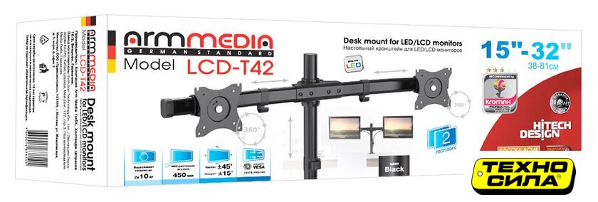 настенный кронштейн для ЖК-телевизора 22-65", наклон 15°, поворот 160°, цвет темно-серый