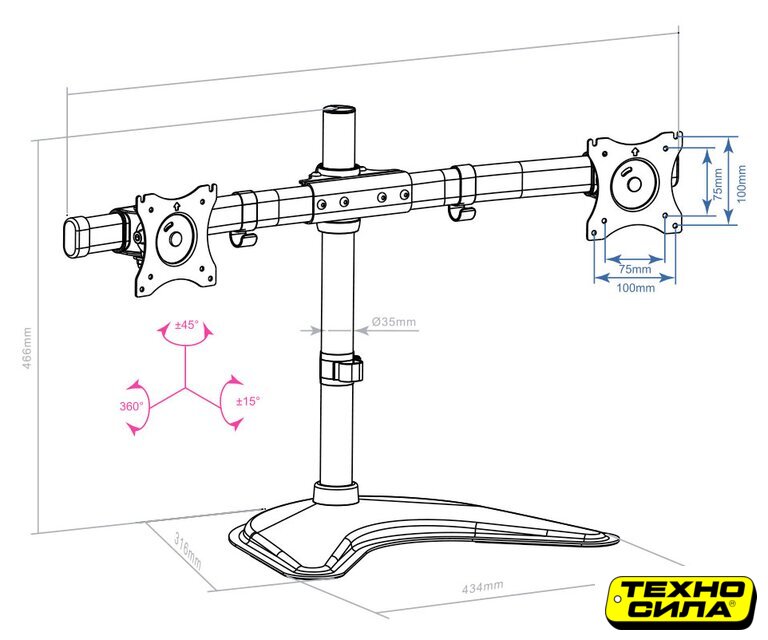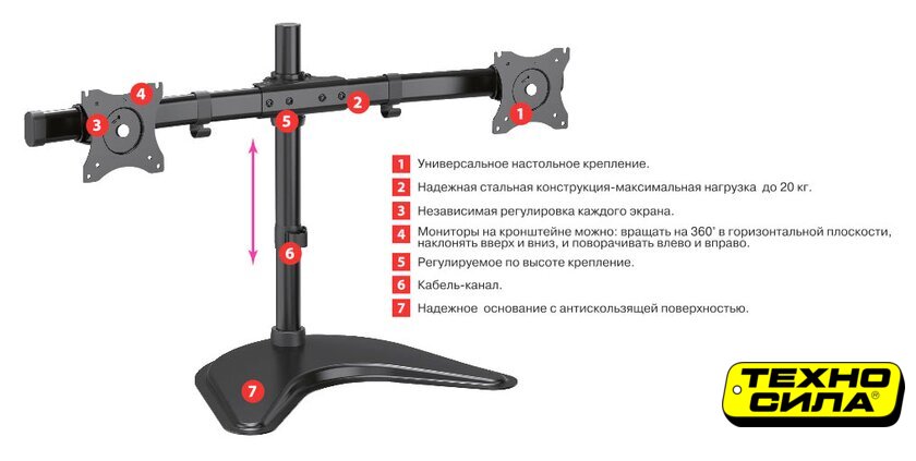 для мониторов, 13-34", 2 монитора, настольный, поворотный, с регулировкой высоты, кабель-канал, струбцинное крепление, наклон 45°, поворот 180°, цвет черный