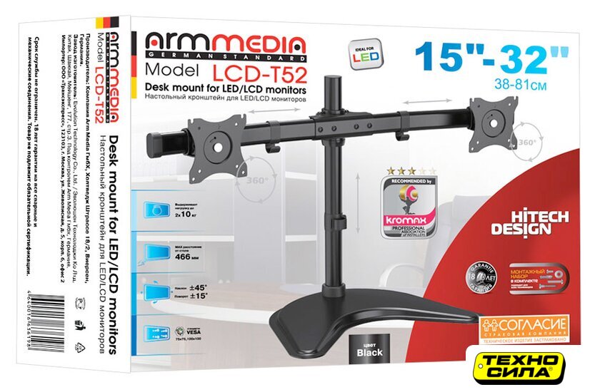 для мониторов, 17-32", 1 монитор, настольный, поворотный, с регулировкой высоты, кабель-канал, наклон 90°, поворот 180°, цвет черный
