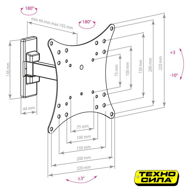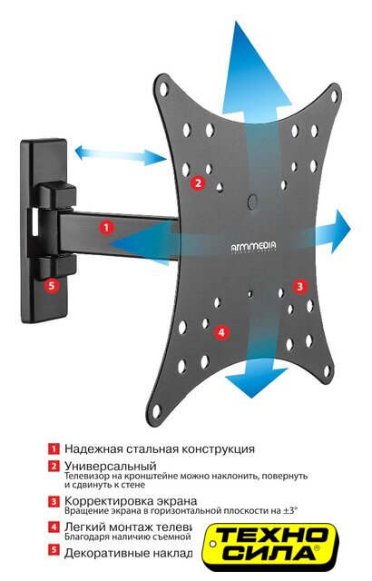 настенный кронштейн для ЖК-телевизора 10-26", наклон 20°, поворот 90°, цвет черный