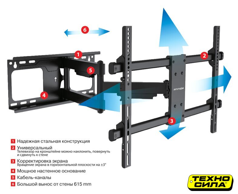 для ЖК-телевизоров, 32-75", настенный, наклон 10°, поворот 160°, цвет черный