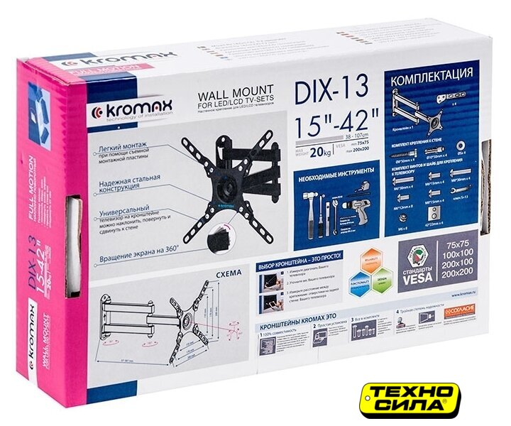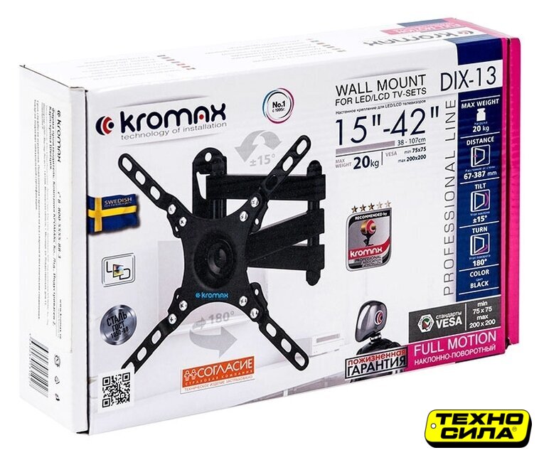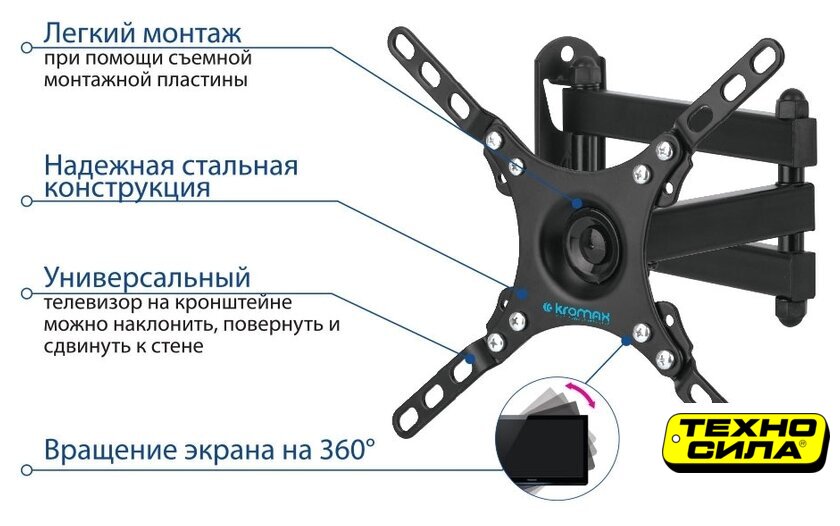 настенный кронштейн для ЖК-телевизора 32-75", наклон 15°, поворот 60°, цвет черный