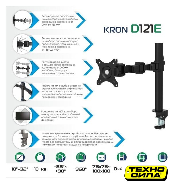 для мониторов, 17-27", 1 монитор, настольный, поворотный, с регулировкой высоты, кабель-канал, наклон 45°, поворот 180°, цвет черный