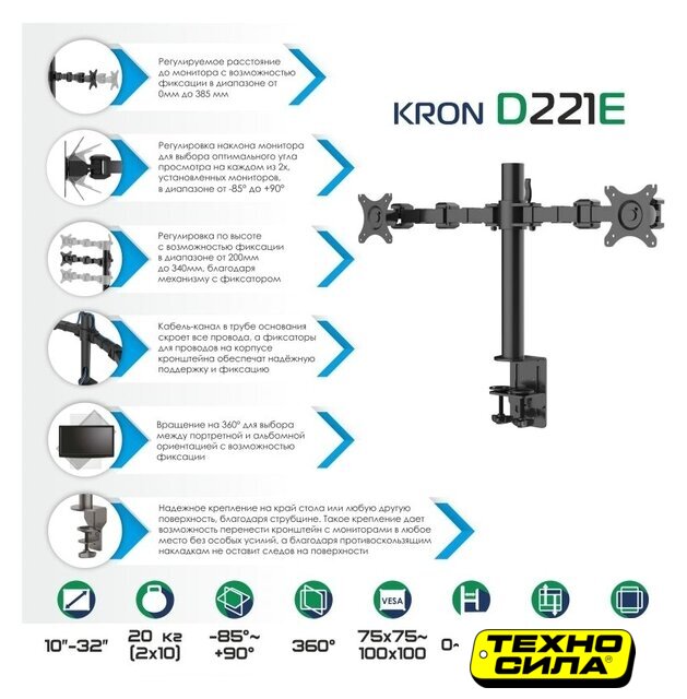настенный кронштейн для ЖК-телевизора 32-75", наклон 10°, поворот 180°, цвет черный
