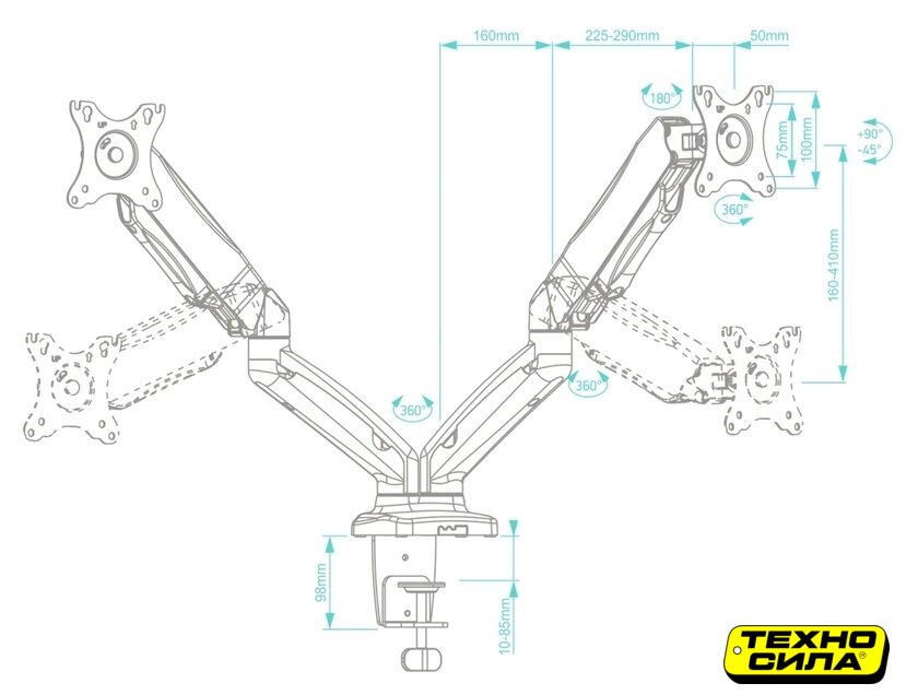 для мониторов, 17-32", 2 монитора, настольный, поворотный, с регулировкой высоты, кабель-канал, струбцинное крепление, наклон 20°, поворот 20°, цвет черный