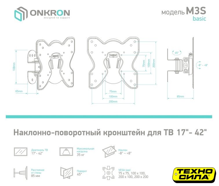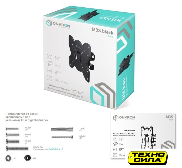 настенный кронштейн для ЖК-телевизора 22-47", наклон 15°, цвет черный