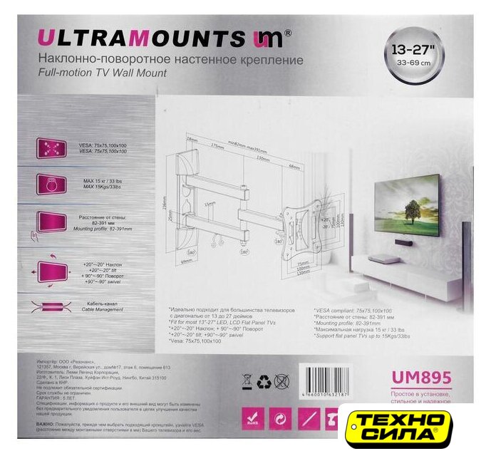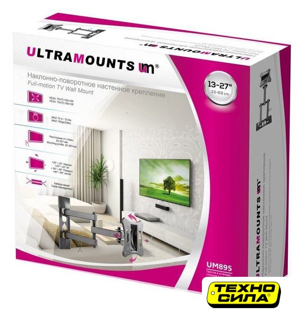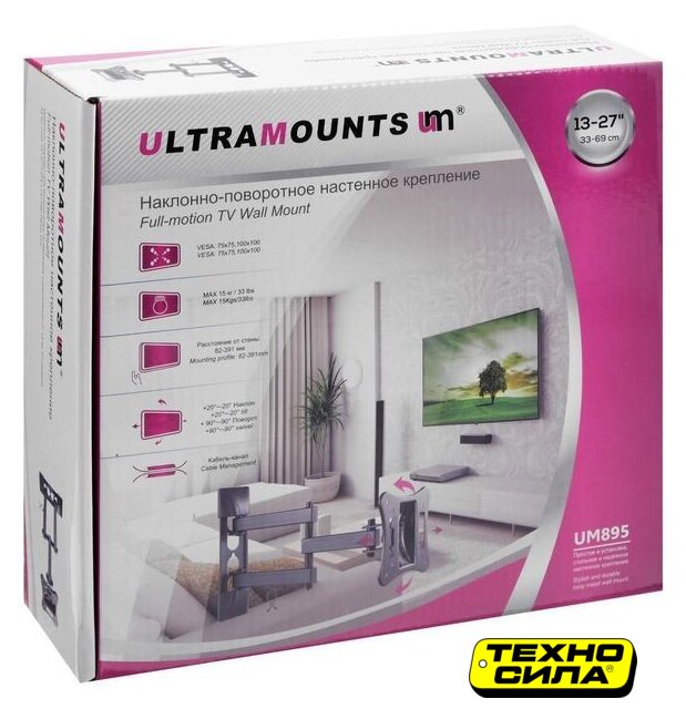 настенный кронштейн для ЖК-телевизора 13-27", наклон 10°, поворот 90°, цвет черный