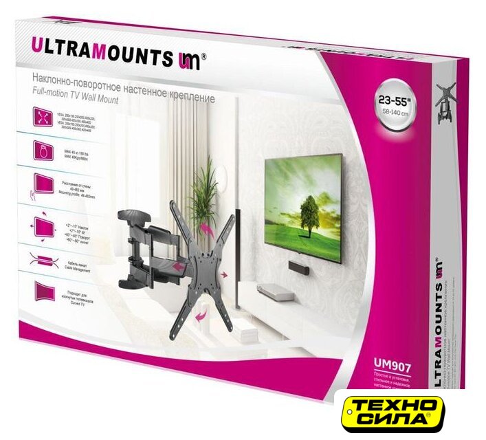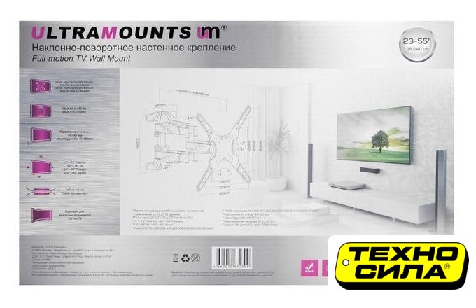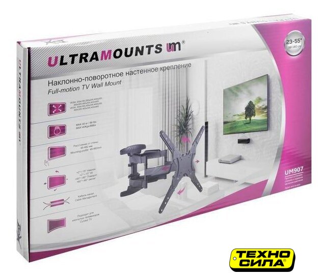 для ЖК-телевизоров, 32-55", настенный, поворотный, кабель-канал, наклон 25°, поворот 90°, цвет черный