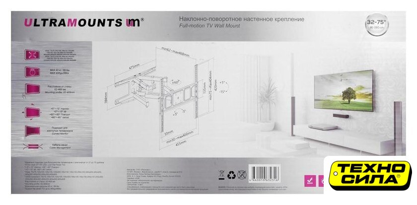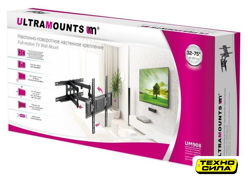 для ЖК-телевизоров, 32-65", настенный, поворотный, наклон 5°, поворот 50°, цвет черный
