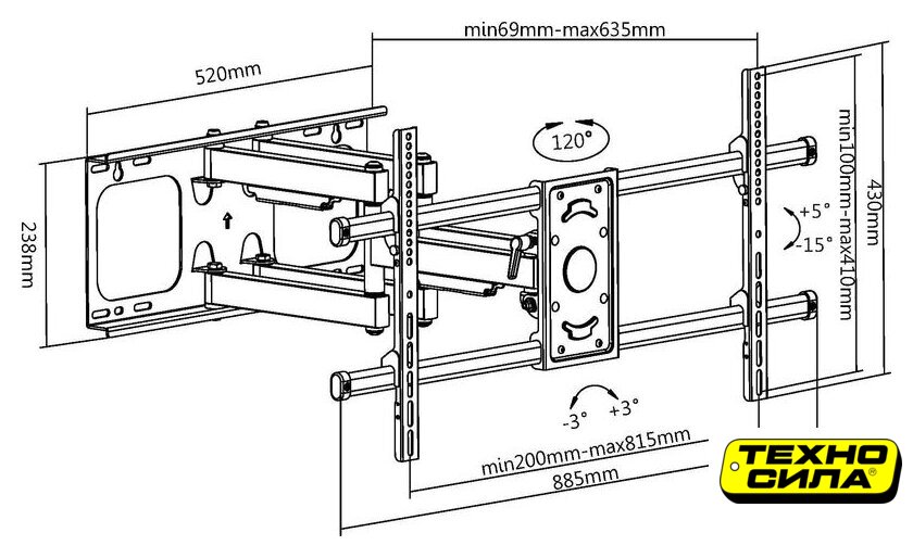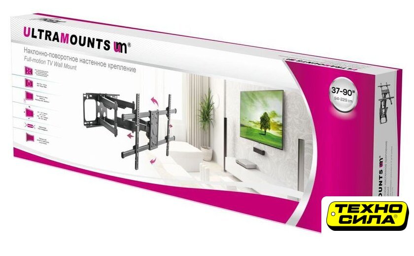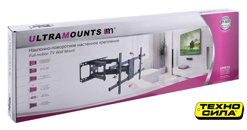 для ЖК-телевизоров, 37-75", настенный, поворотный, наклон 15°, поворот 90°, цвет черный