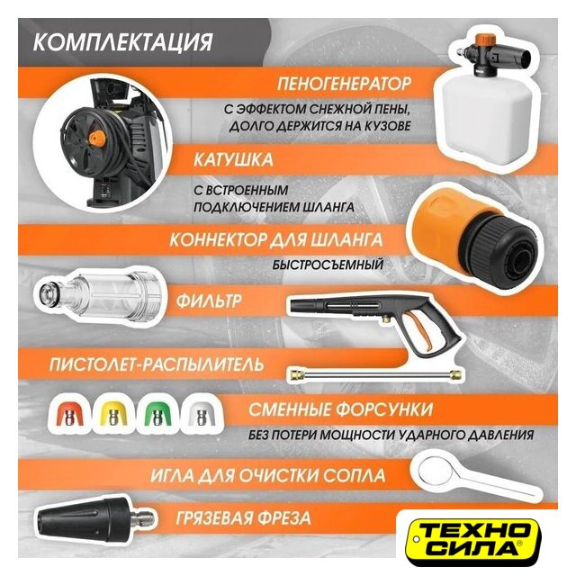 Комплектация | Пистолет-распылитель (1 шт)Напорный шланг (1 шт)Пеногенератор (1 шт)Фильтр (1 шт)Сменные форсунки (4 шт)Коннектор для шланга быстросъемный (1 шт)Игла для очистки сопла (1 шт)Грязевая фреза (1 шт) |