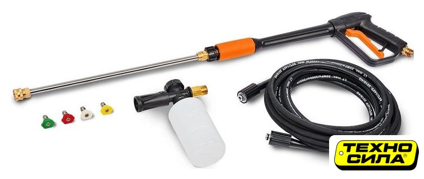 Комплектация | • Мойка высокого давления;• Пистолет;• Шланг высокого давления;• Насадка на пистолет распылительная;• Четыре быстросъемные насадки на сопло;• Дополнительный фильтр тонкой очистки;• Быстросъемный коннектор;• Пеногенератор;• Игла для прочистки сопла;• Руководство пользователя;• Гарантийный талон. |