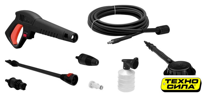 Комплектация | Очиститель высокого давления; Шланг высоконапорный - 8м; Пистолет; Удлинительная насадка; Грязевая фреза; Плоская фреза; Пеногенератор; Щетка вращающаяся; Фильтр тонкой очистки. |
