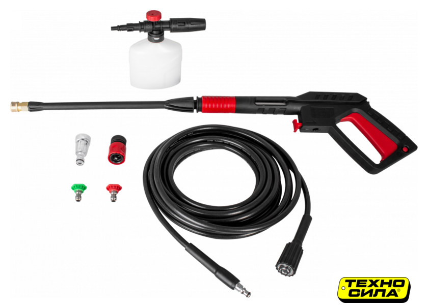 Комплектация | - Мойка высокого давления 1 шт.- Пистолет-распылитель разборный 1 шт.- Шланг высокого давления 1 шт.- Пеногенератор 1 шт.- Игла для очистки сопла 1 шт.- Сменные форсунки 2 шт.- Фильтр 1 шт.- Быстросъёмный коннектор для подачи вод |