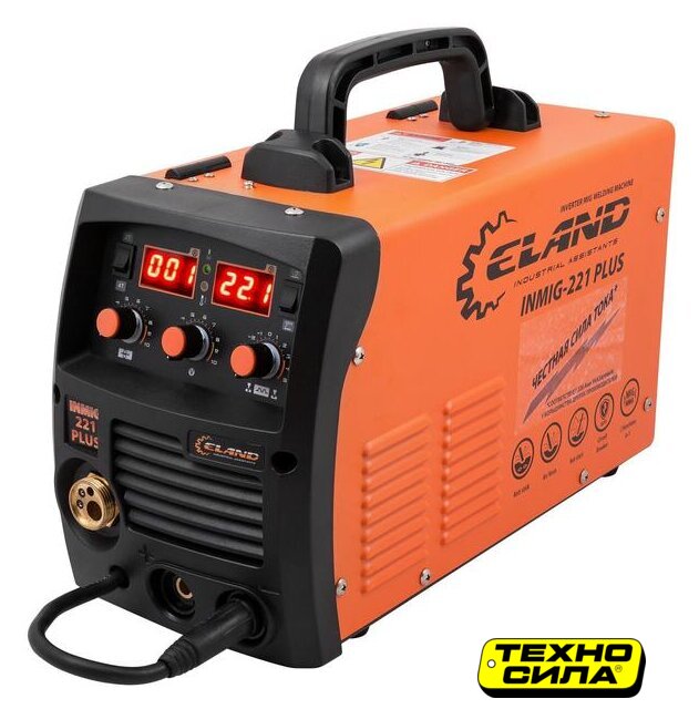 ручная дуговая сварка (MMA)/полуавтоматическая сварка (MIG MAG)/аргонодуговая сварка (TIG), 220 В, сварочный ток: 10–160 А, диаметр электрода: 0.8–1 мм, 8 кг