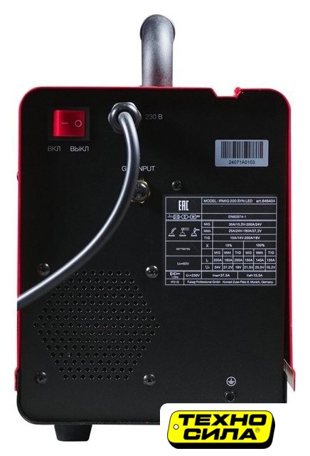 ручная дуговая сварка (MMA)/полуавтоматическая сварка (MIG MAG), 220 В, сварочный ток: 20–200 А, диаметр электрода: 1.6–4 мм, 14 кг