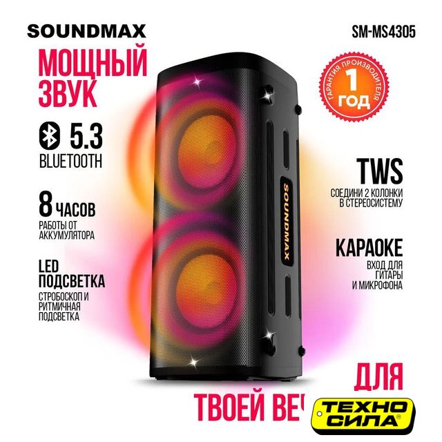 номинальная мощность 100 Вт, воспроизведение с USB, питание от сети и аккумулятора, BT 5.1, AUX, влагозащита IPX4, время работы: 6 ч.